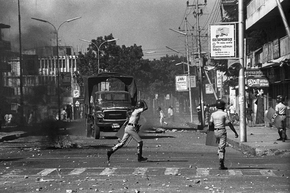 ঢাকা, ১৯৮৭। স্বৈরাচার বিরোধী আন্দোলনকারীদের ছোঁড়া পাথরের জবাবে গুলি ছুঁড়ছে পুলিশ