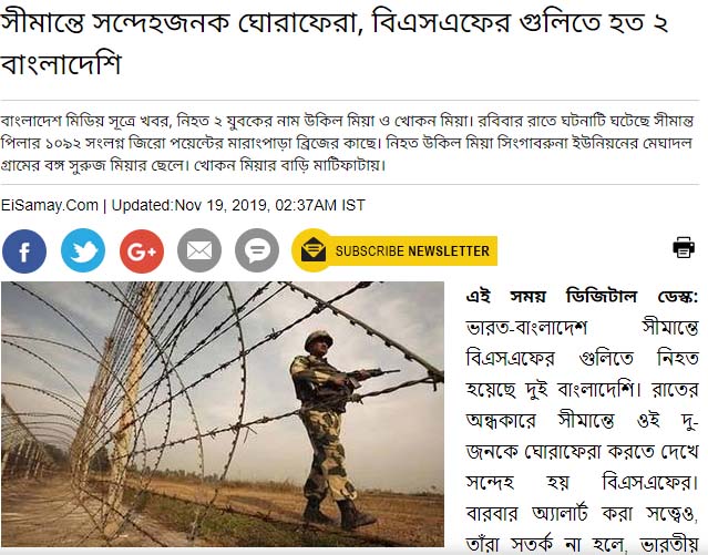 ভারত-বাংলাদেশ সীমান্তে বিএসএফের গুলিতে নিহত হওয়ার আগে রাতের অন্ধকারে সীমান্তে ওই দু-জনকে ঘোরাফেরা করতে দেখে সন্দেহ হয় বিএসএফের। বারবার অ্যালার্ট করা সত্ত্বেও, তাঁরা সতর্ক না হলে, ভারতীয় সীমান্তরক্ষী বাহিনীর জওয়ানেরা গুলি চালায়। নিহত হয় ওই দুই বাংলাদেশি। রোববার গভীর রাতে সীমান্ত লাগোয়া বাংলাদেশের শেরপুরে এই ঘটনার জেরে সাময়িক উত্তেজনা তৈরি হয়। সূত্রের খবর, নিহতেরা সীমান্তে সঙ্ঘবদ্ধ গরু পাচারের একটি চক্রের সঙ্গে যুক্ত ছিল।